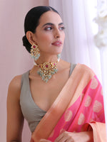 A Gold Tone Choker Necklace Set studded with simulated kundan, maroon, green stones, and beads. The details of the set are as follows: