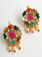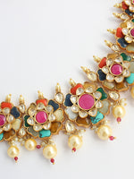 Gold plated Bib Necklace Set Studded with Simulated Polki Diamond Faux Pearl & Navratan (Multicolor) Stones.