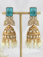 Gold plated jhumka/ jhumki earrings studded with simulated polki diamonds, CZS, aqua, green shattered stones and pearl beads.