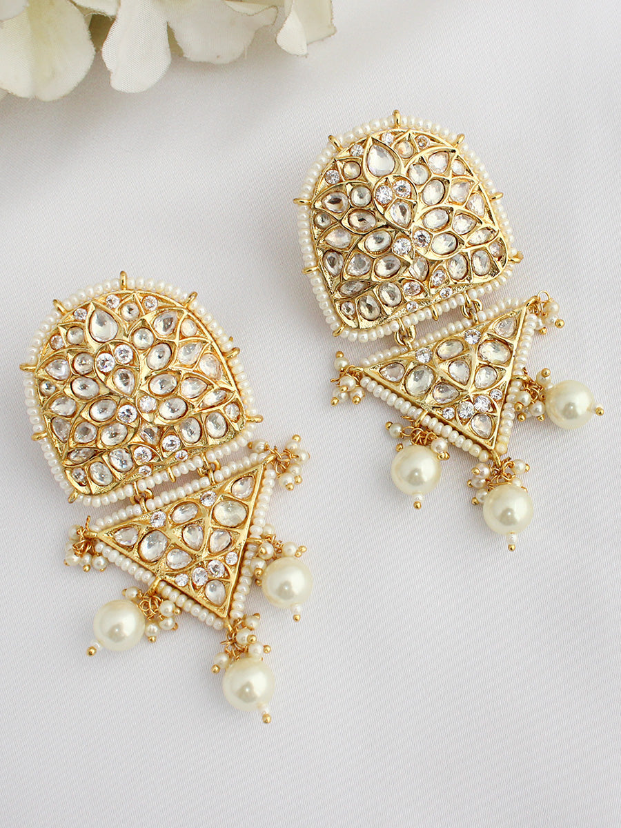- Gold Plated Dangle Earrings Studded With Simulated Diamond Polki and Faux Pearl