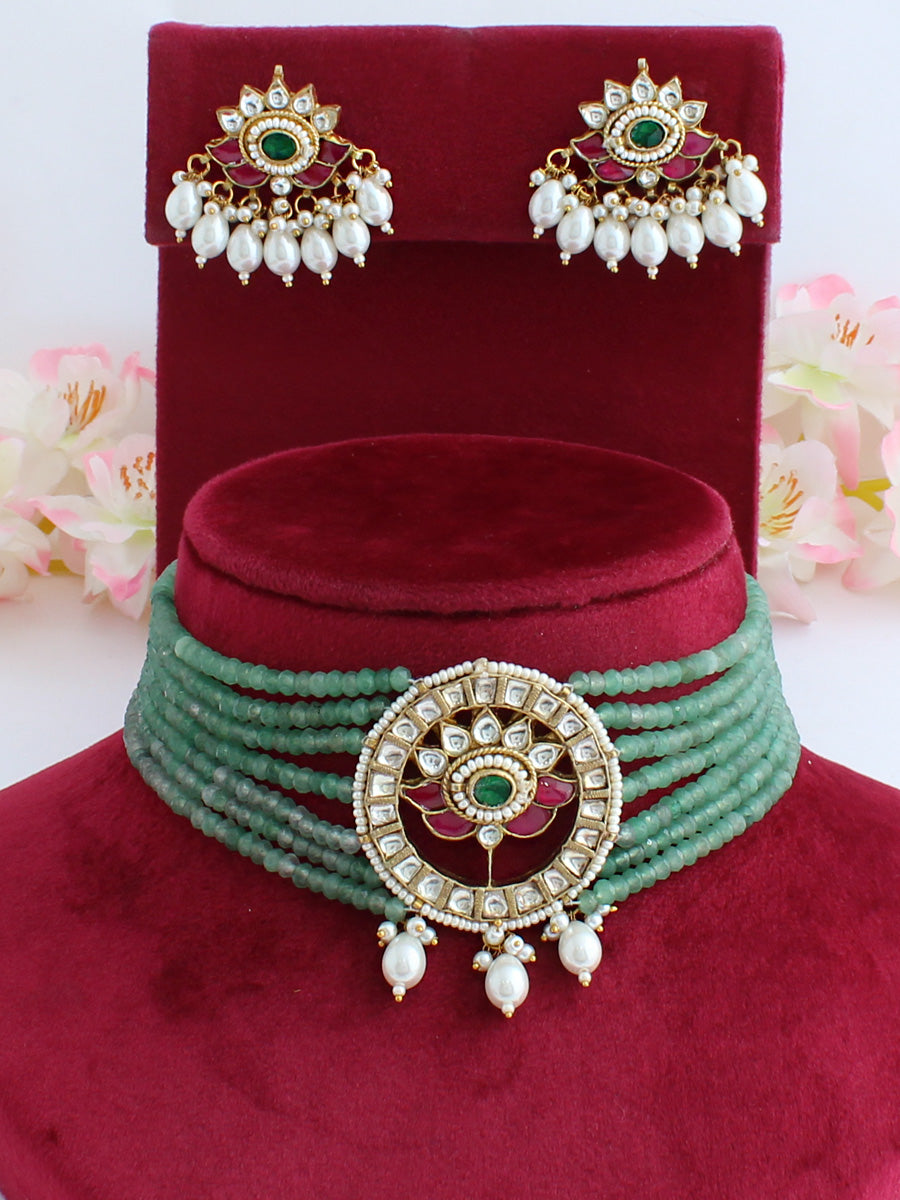 Introducing our Gold-Plated Choker Necklace Set, adorned with simulated Kundans, hot pink, green stones and shaded mint green beads for an exquisite and regal look.