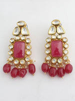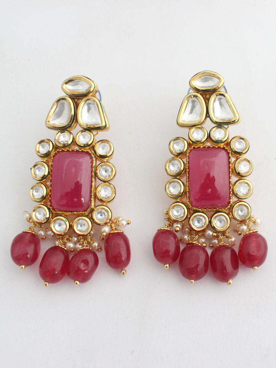 Gold Plated Choker Necklace Set Studded with Simulated Polki Diamond Maroon Stone Faux Pearl and Maroon Beads.
