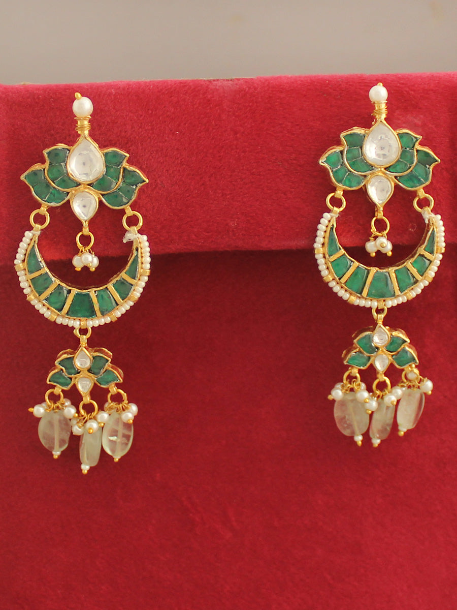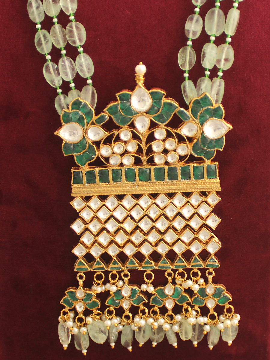 Gold plated long necklace set studded with simulated kundans, green stones, faux pearls and mint green beads.