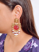 Gold tone dangle long earrings studded with maroon carved stones, faux pearls and beads.