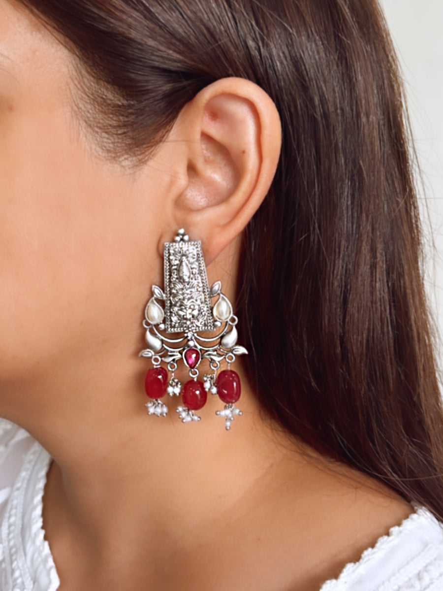 Gold / silver tone earrings studded with green & maroon stones and faux pearls and beads.