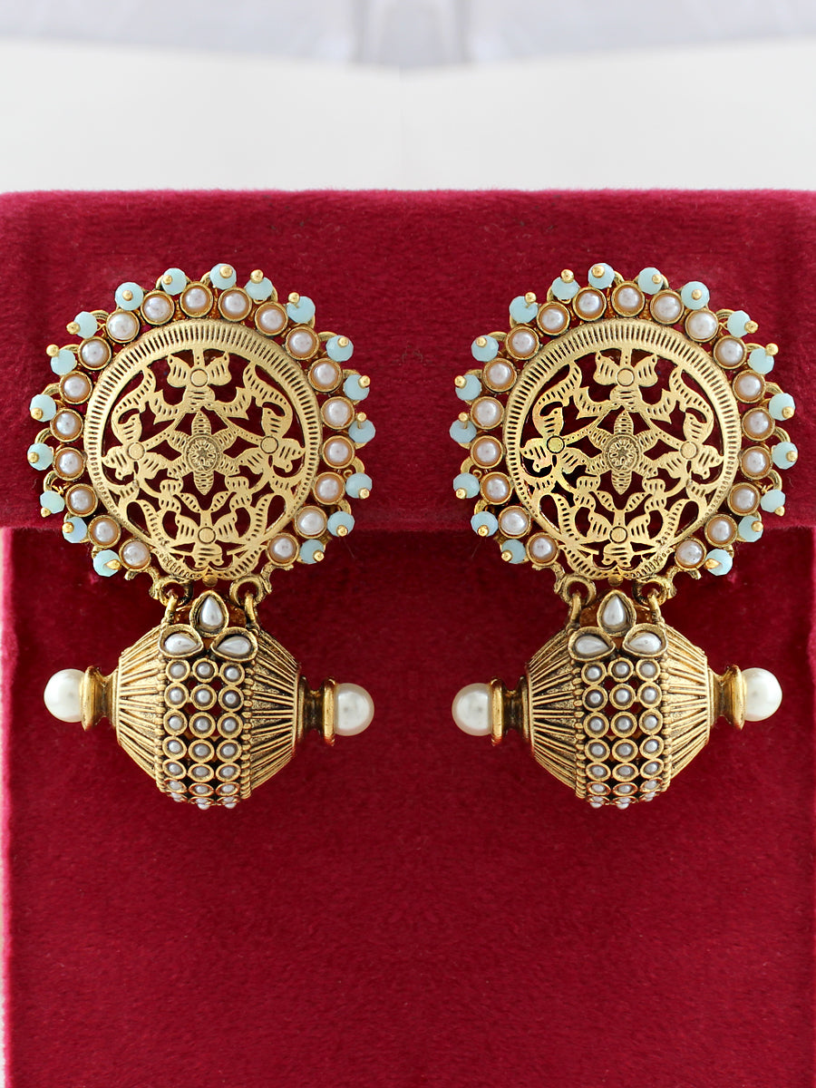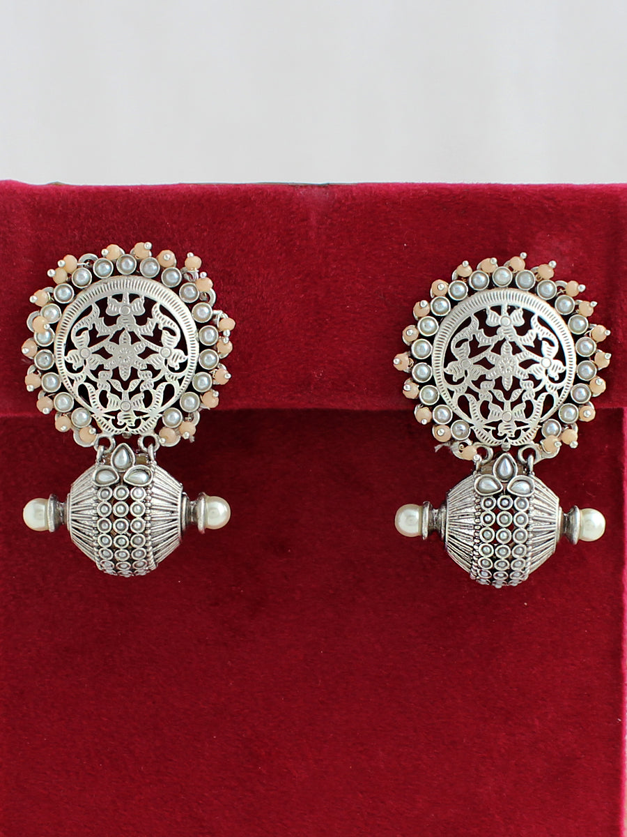 - Silver / Gold tone earrings studded with faux pearls, peach and aqua beads.