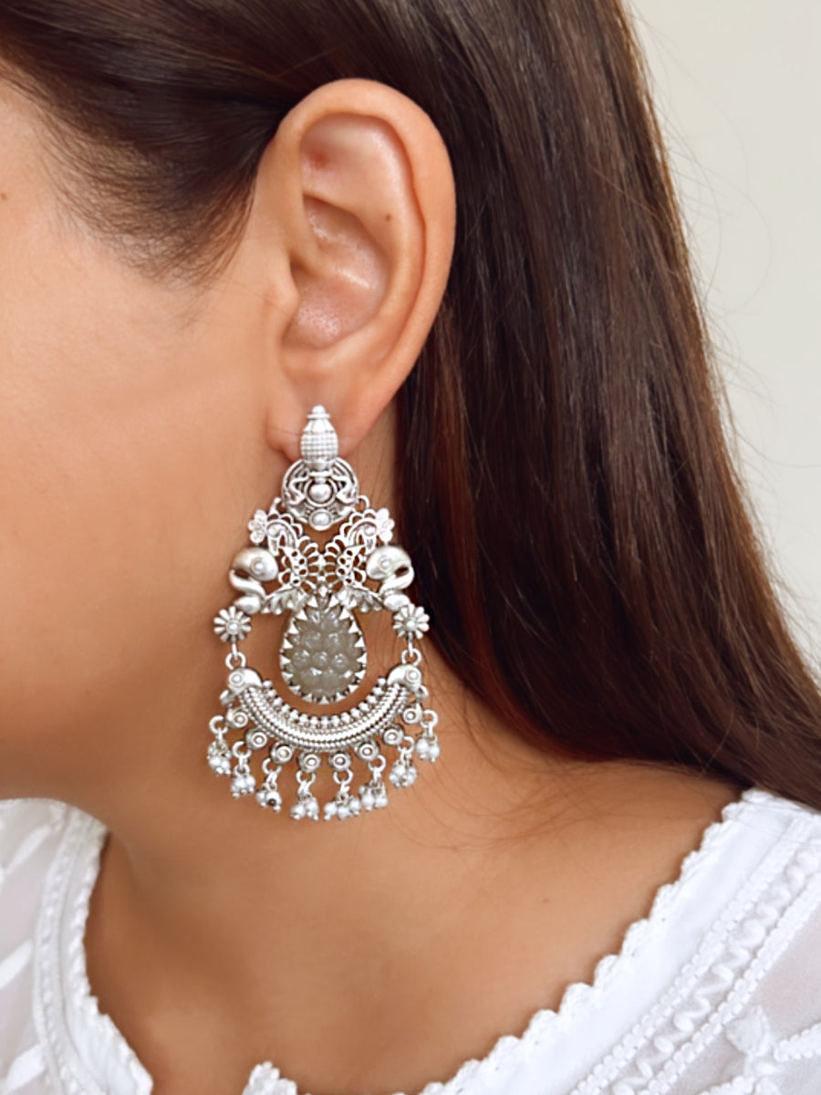 - Gold / Silver dangle earrings studded with mint green & grey carved stones, faux pearl and beads.