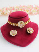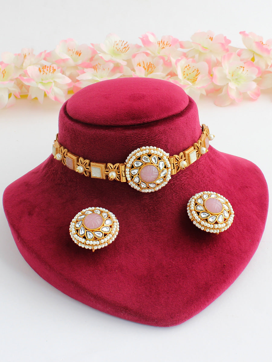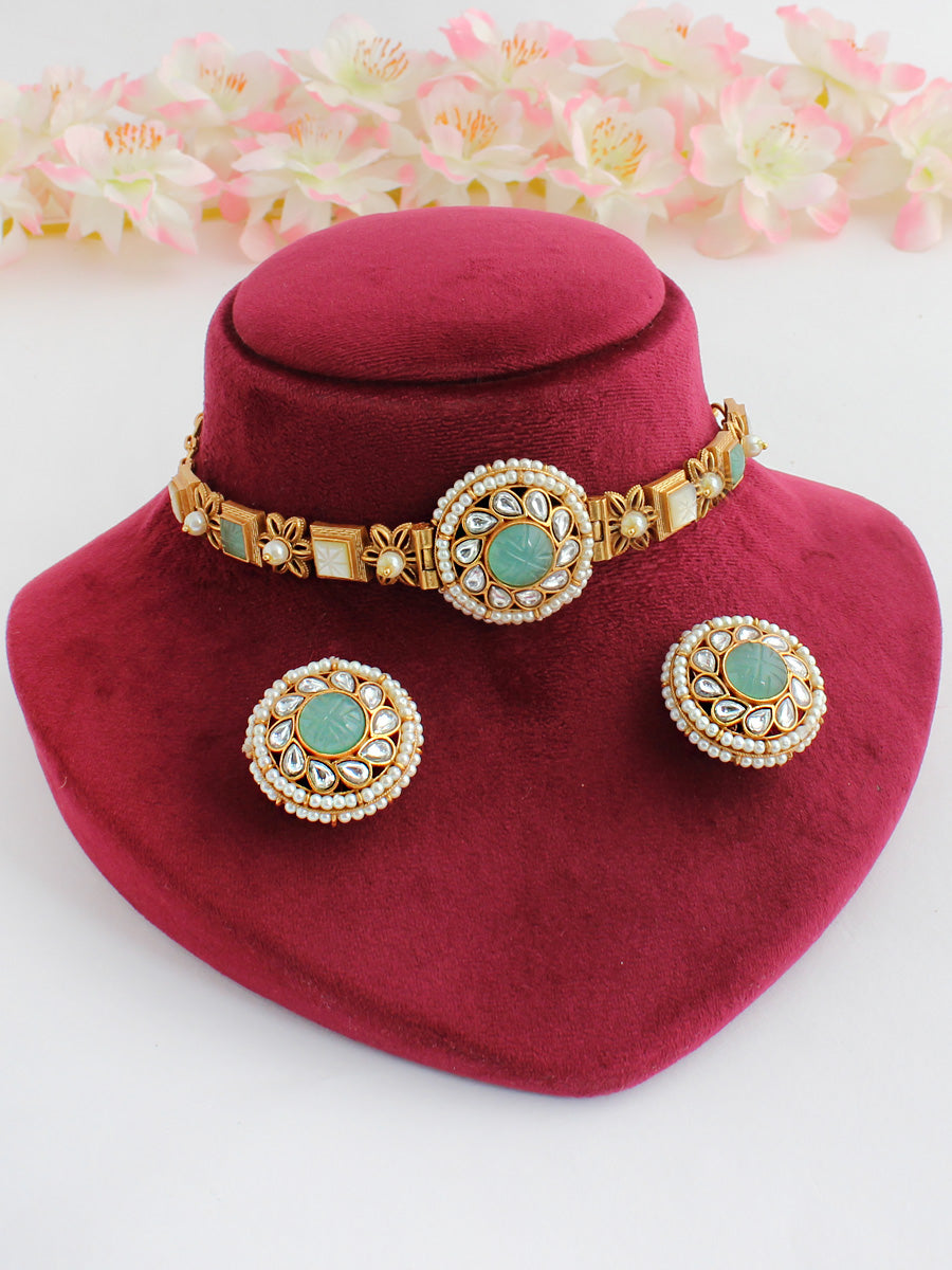 Gold plated choker necklace set studded with simulated polki diamonds, multi color carved stones and faux pearls.