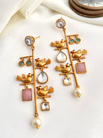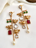 Long earrings with a matte gold finish, adorned with simulated polki diamonds, carved stones, and faux pearls. The earrings measure approximately 90 x 5mm or 3 1/2" x 1/4" and feature post back findings for pierced ears. Crafted from high-grade alloy metal, these earrings showcase a unique blend of intricate design and contemporary style.