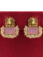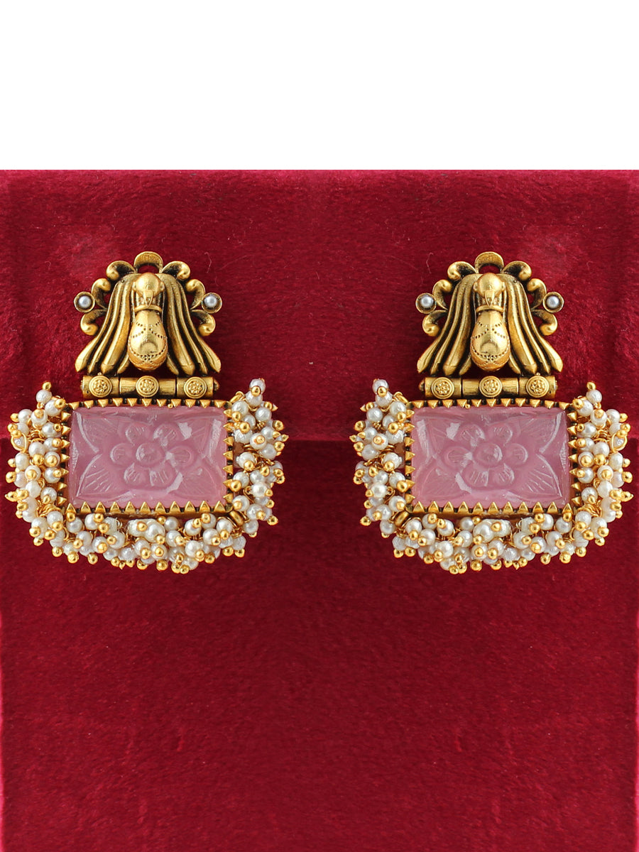 - Gold / silver tone earrings studded with white & pastel pink, white carved stones and faux pearl beads.