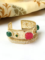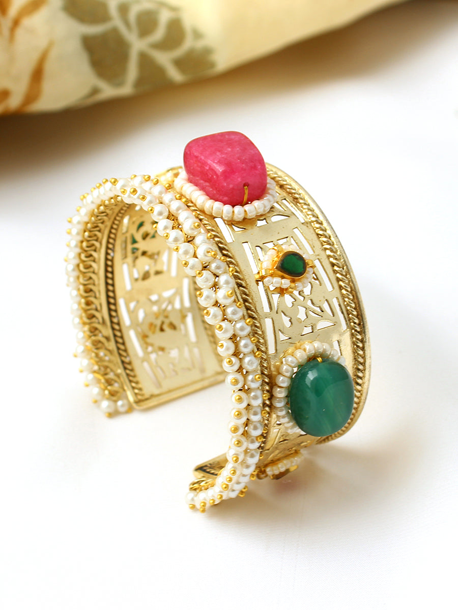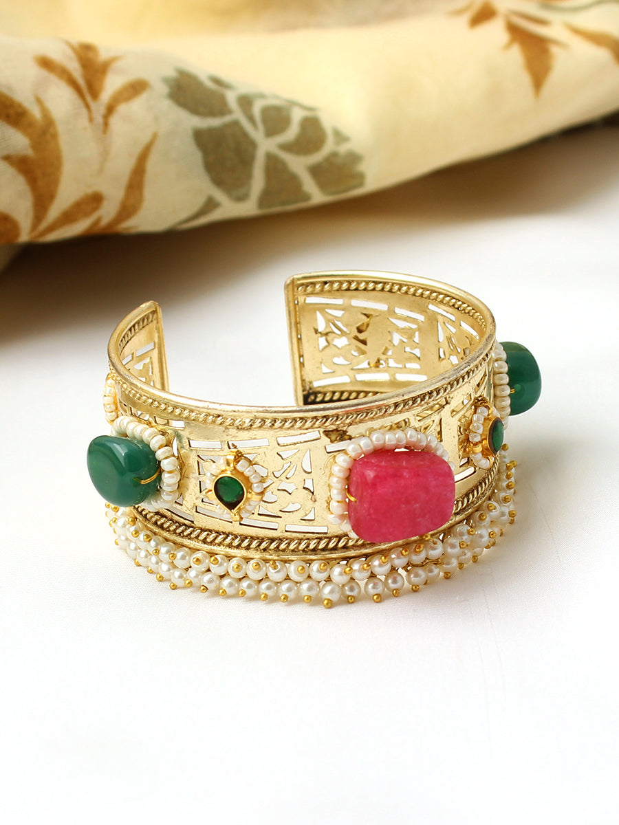Introducing the Sheel Matte Gold Cuff Bangle – a stunning fusion of traditional design and elegant craftsmanship. This beautifully handcrafted piece is made from high-grade alloy metal, featuring a unique matte gold finish that enhances its timeless appeal. The cuff is intricately studded with natural stones, delicately lined with faux pearls that add a soft, festive charm. Each bangle is a true statement accessory, perfect for weddings, festive occasions, or cultural celebrations. Designed with an open-back style for ease and comfort, this bangle fits up to size 2.10, making it both versatile and wearable.