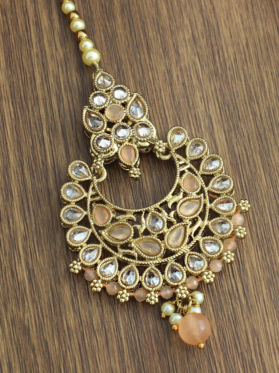 Gold Tone Maang Tikka Studded with Simulated Polkis, Faux Pearls, Pink, Blue, Peach, Green, Turquoise Stones and Beads.
