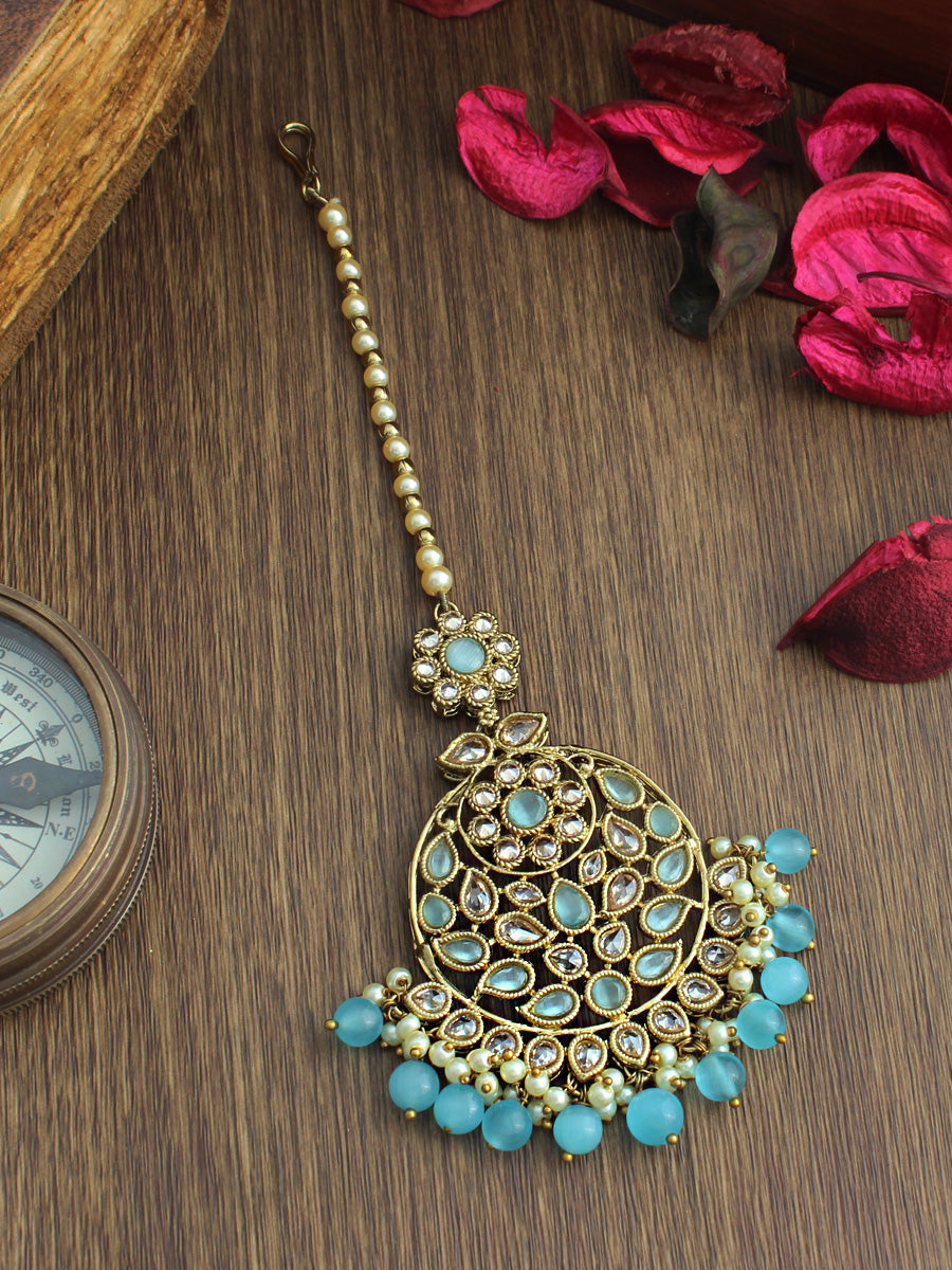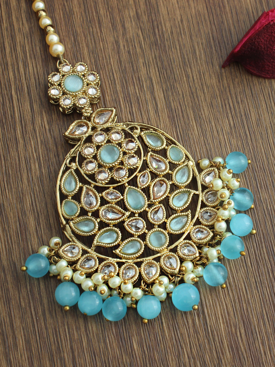 Gold Tone Maang Tikka Studded with Simulated Polkis, Faux Pearls, Maroon, Green, Mint Green, Turquoise Stones and Beads.