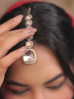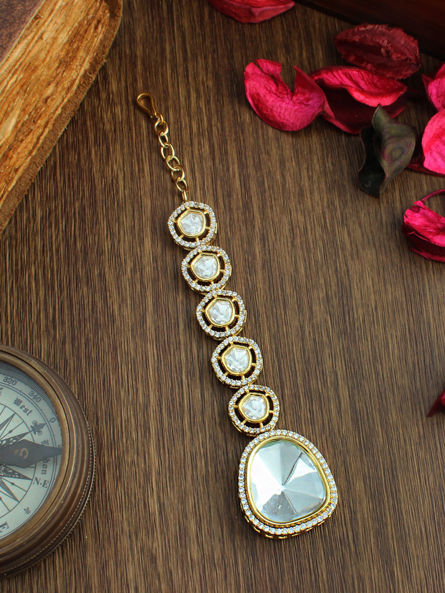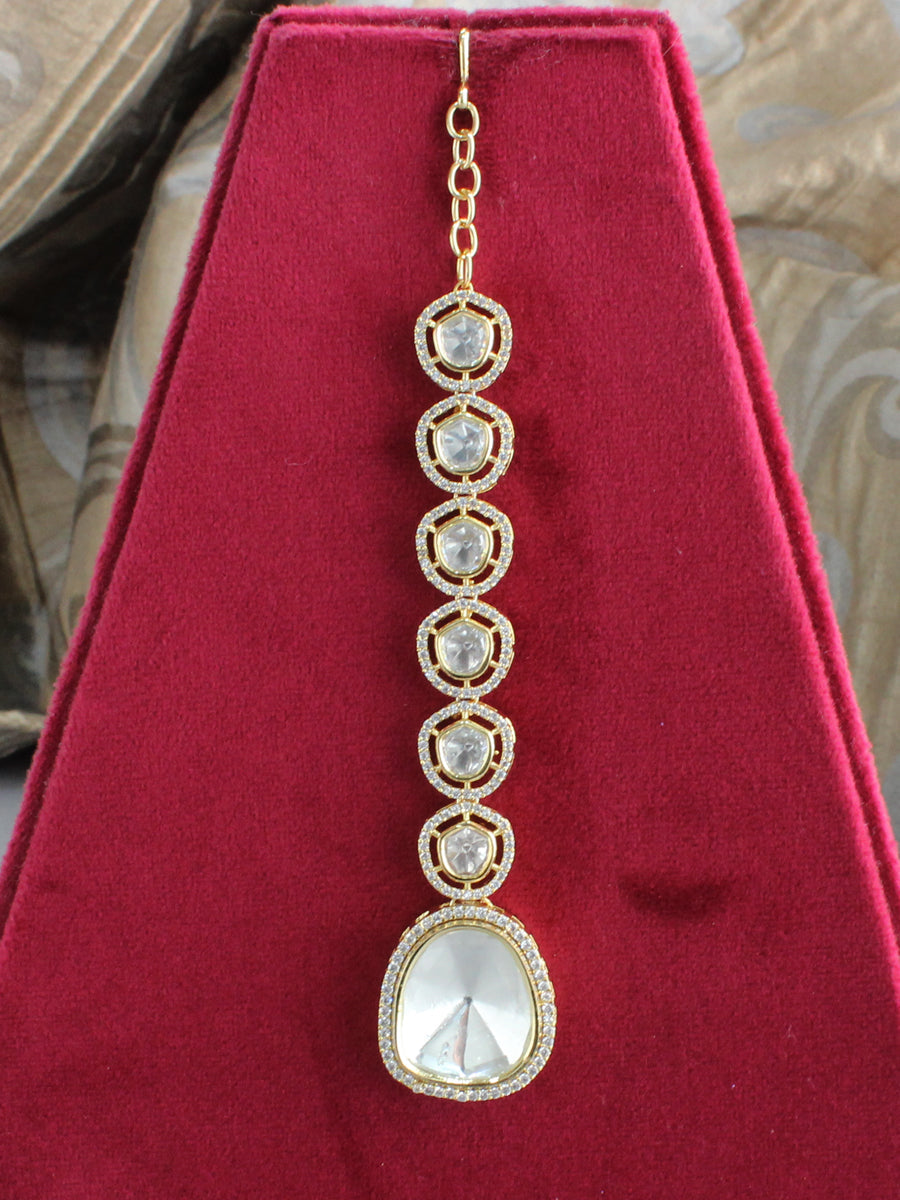 The two-tone maang tikka is studded with simulated Polki diamonds and CZs. The tikka measures approximately 5 1/2" in length and has a width of 20mm (3/4"). The base is made of high-grade alloy metal.