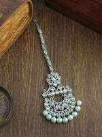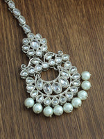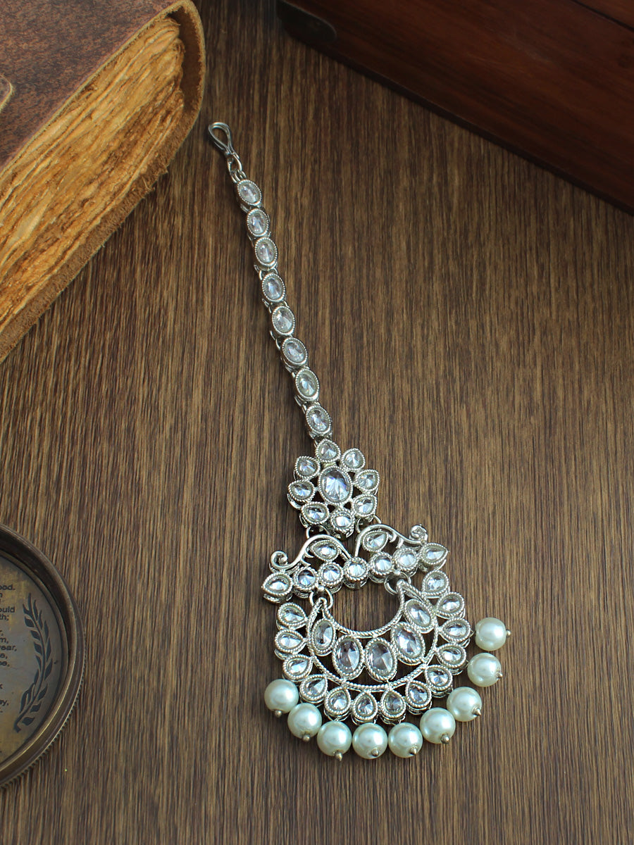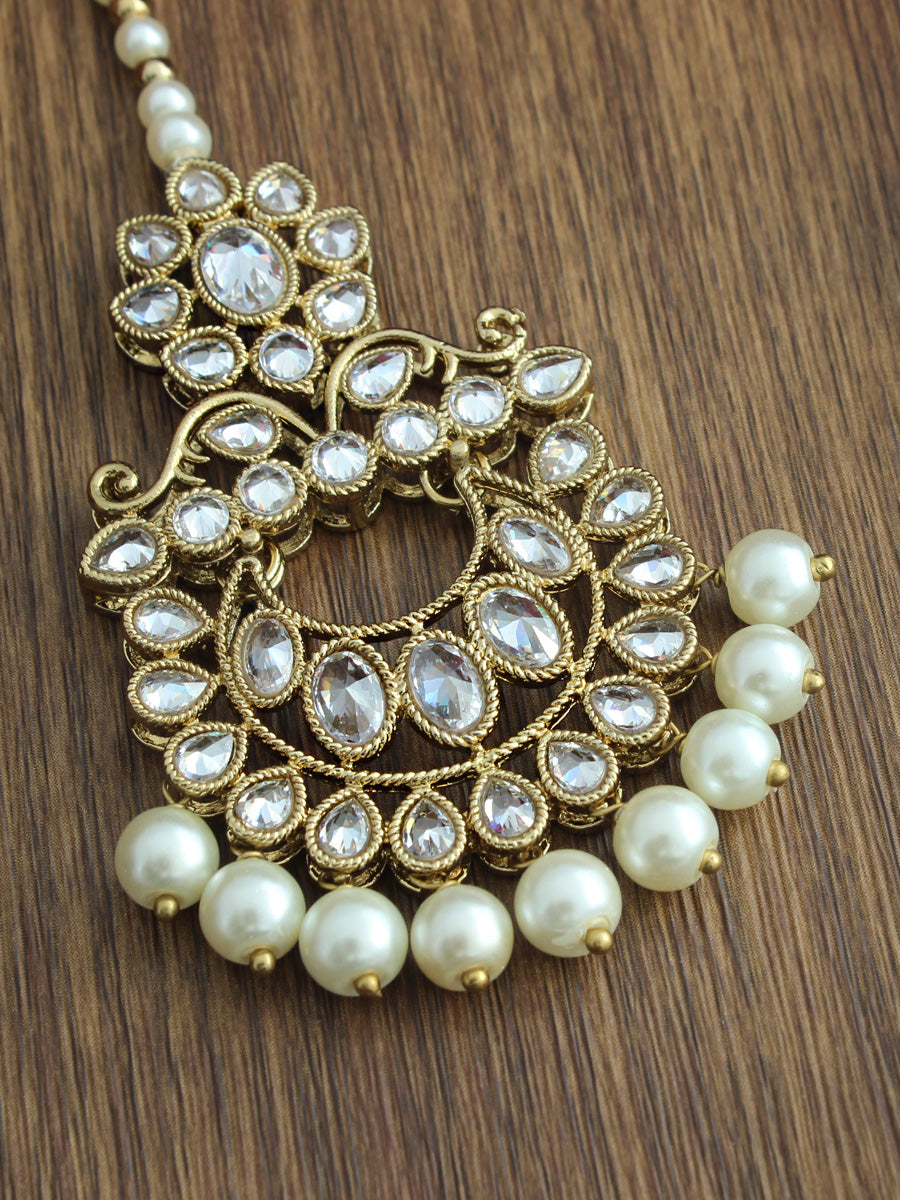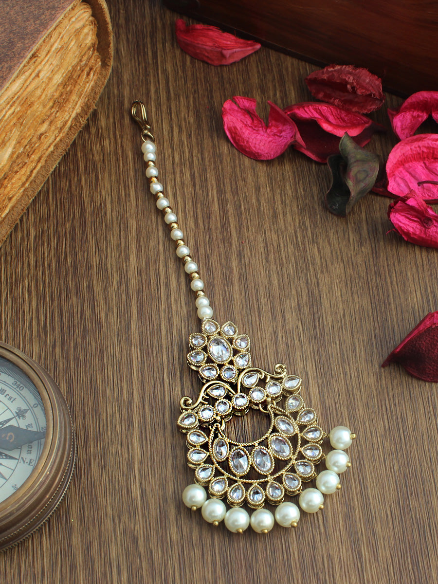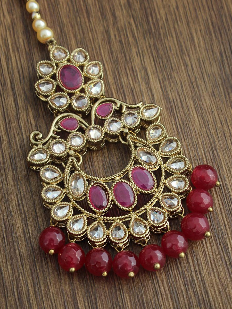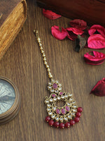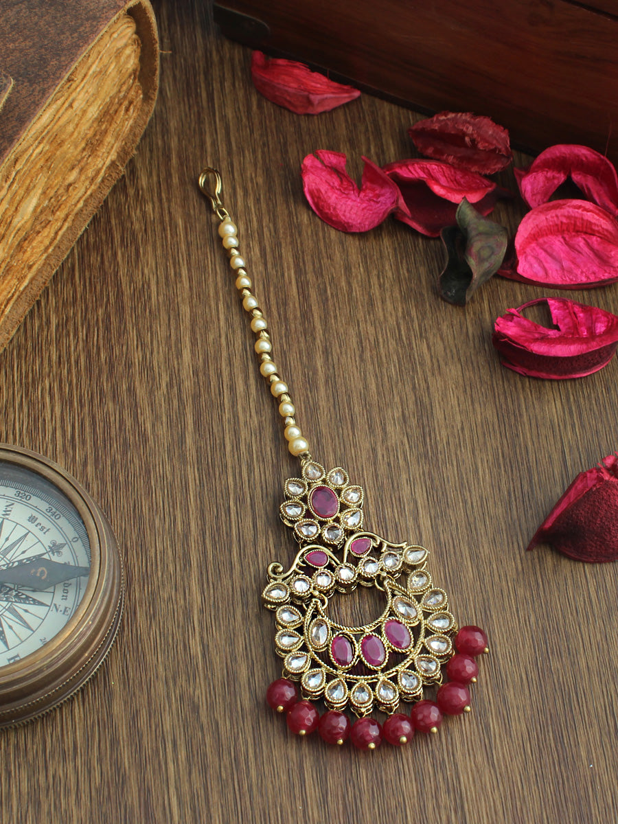 Gold Tone Maang Tikka Studded with Simulated Polki Faux Pearls, Maroon, Sliver Stones and Beads.