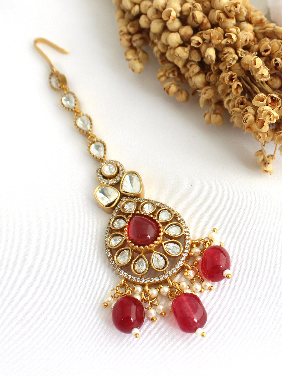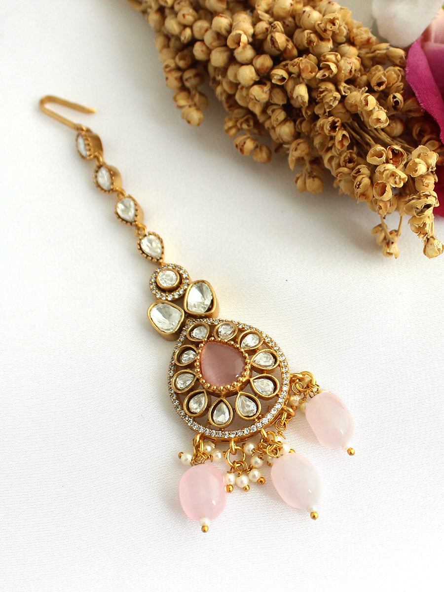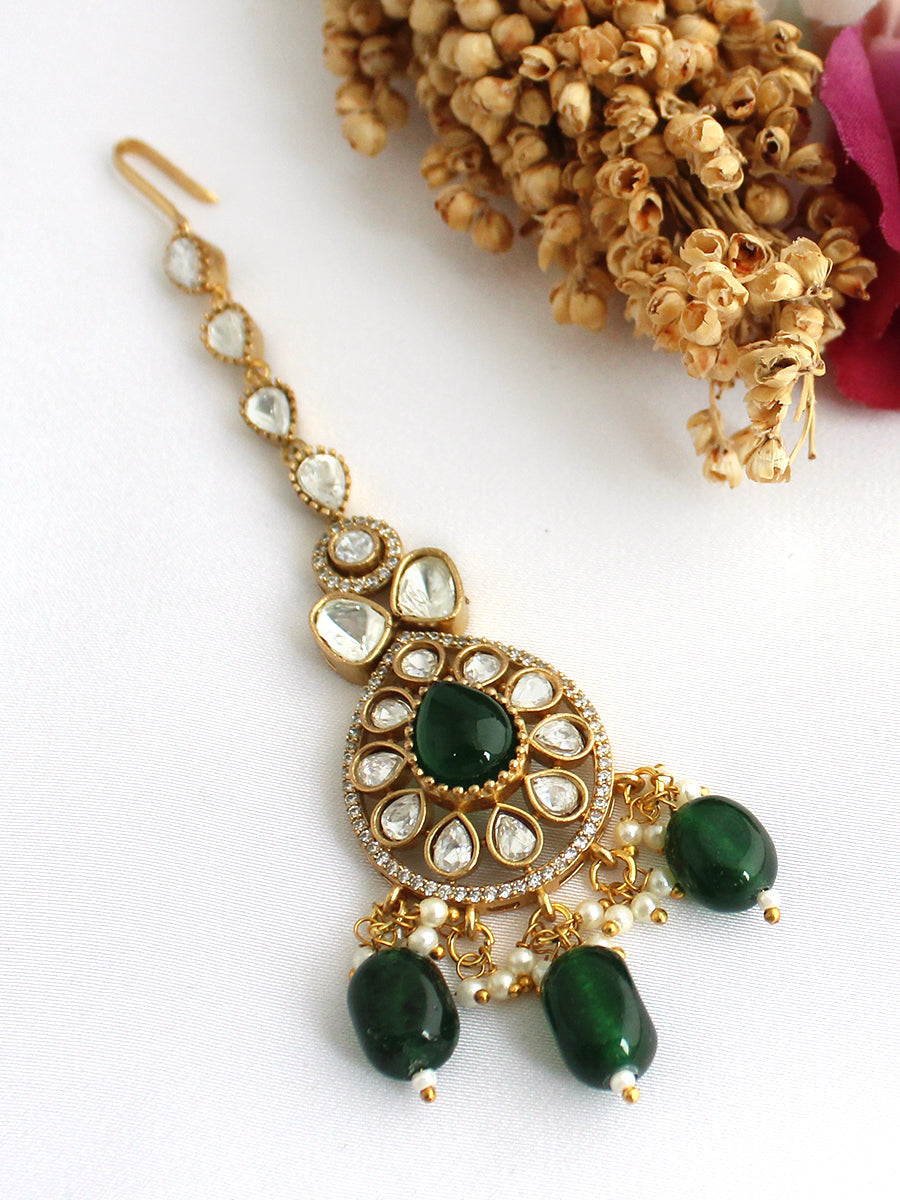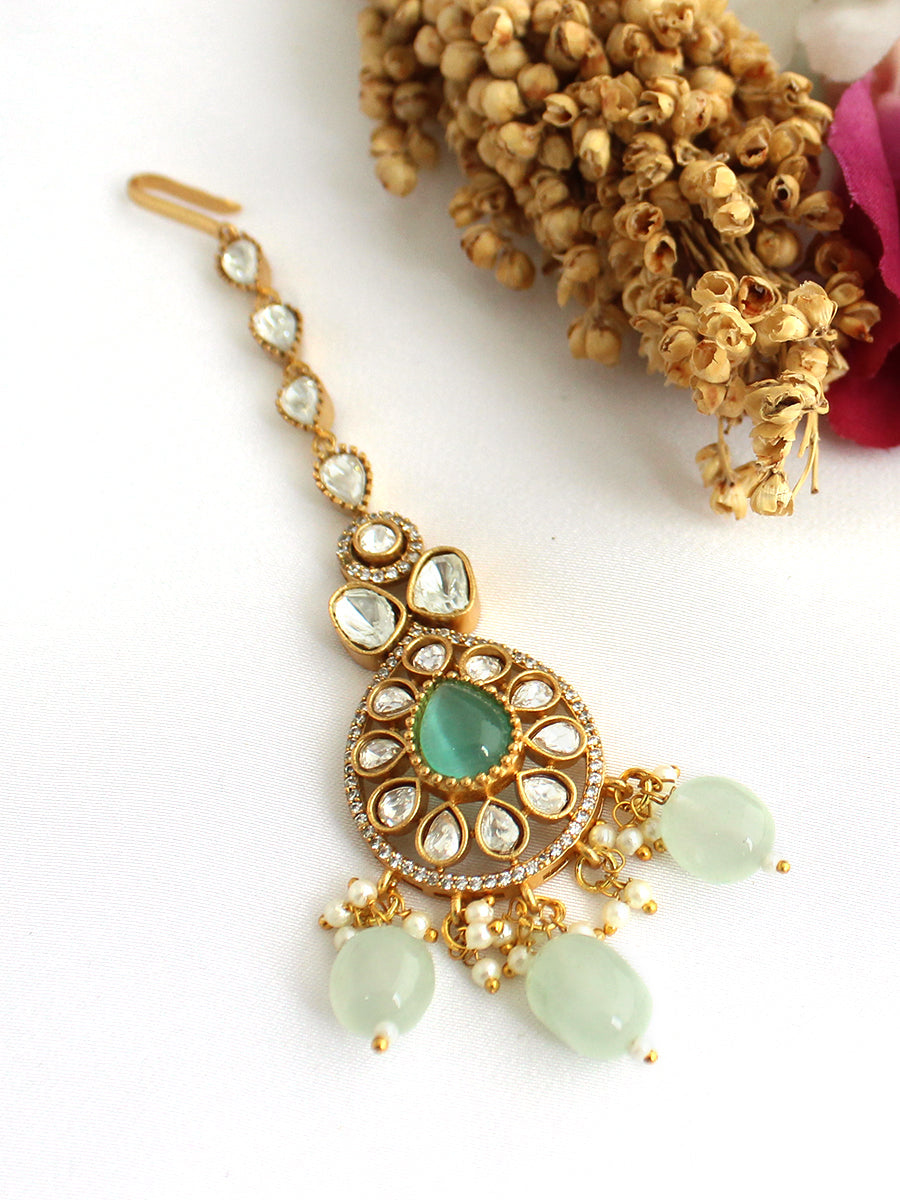 Introducing Our Virisha Gold-Tone Maang Tikka, a radiant accessory that exudes elegance and tradition. Adorned with simulated polki diamonds, sparkling CZs, colored stones, and delicate beads, this exquisite piece is a perfect blend of intricate craftsmanship and graceful design. Crafted from high-grade alloy metal and finished in a rich gold tone, it beautifully complements festive and bridal looks. Whether it's a wedding, celebration, or special occasion, this Maang Tikka is designed to enhance your hairstyle and add a regal touch to your overall ensemble.