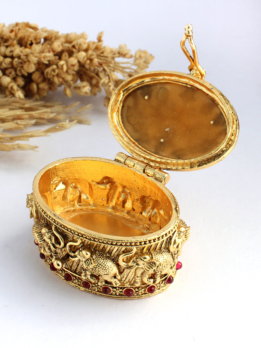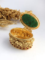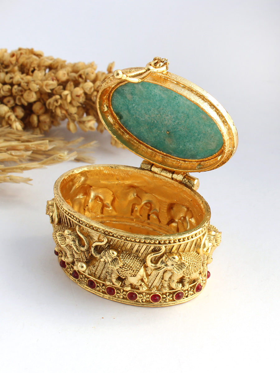 Our oval shape hand crafted vintage trinket box is a harmonious blend of tradition and artistry, a veritable masterpiece that pay homage to our rich Indian heritage. The lid of the box is adorned with Holdali artwork, and the pink & green stones hue adds a touch of symbolism to this exquisite piece, accompanied with gracefully adorned elephant motifs, symbolizing strength, wisdom and prosperity. Vintage trinket boxes hold a special charm due to their historical significance and often unique designs.