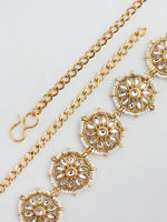 A Gold Tone Belly Chain/Belt studded with simulated Kundans and faux pearl beads. The details of the belly chain/belt are as follows: