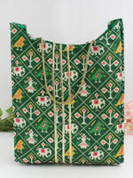 The bag features a patola print, adding a touch of elegance, and is adorned with gotta lace for a beautiful and traditional look. The golden string handle adds a stylish and convenient element to carry the bag. It's a lovely option for wedding favors, providing a charming and functional gift for guests.