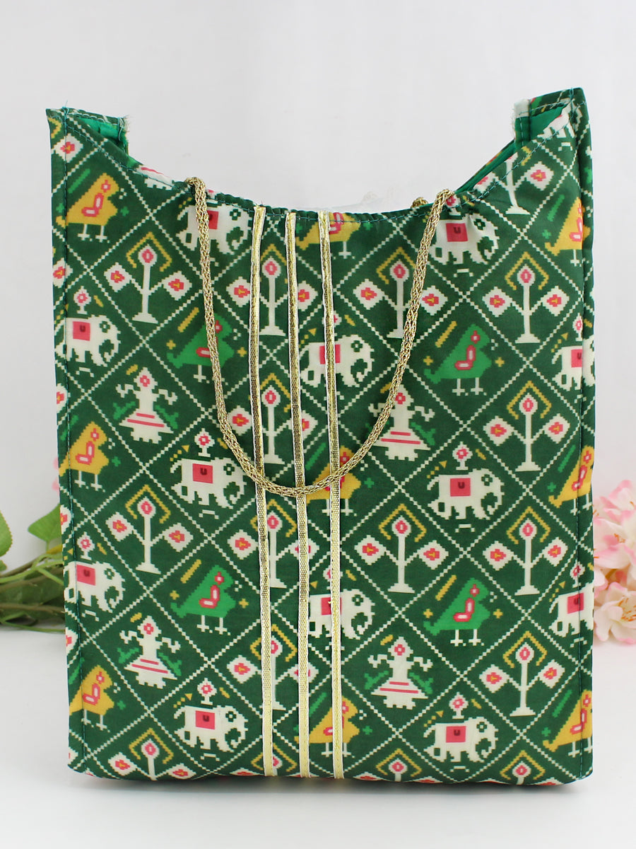 The wedding favors patola print bag adorned with gotta lace is a delightful choice for special occasions. Here are the details: