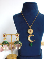 Elevate your ensemble with this exquisite gold-plated Moon (chand) pendant necklace set — a seamless blend of traditional artistry and modern sophistication. Adorned with simulated diamond polkis, shimmering CZ stones, and vibrant hot pink accents, the crescent-shaped earrings dazzles with intricate green enamel work, pearls, and a graceful green bead drop. Crafted from high-grade alloy metal,this statement piece is ideal for festive celebrations and special occasions, offering a radiant blend of opulence and sophistication.