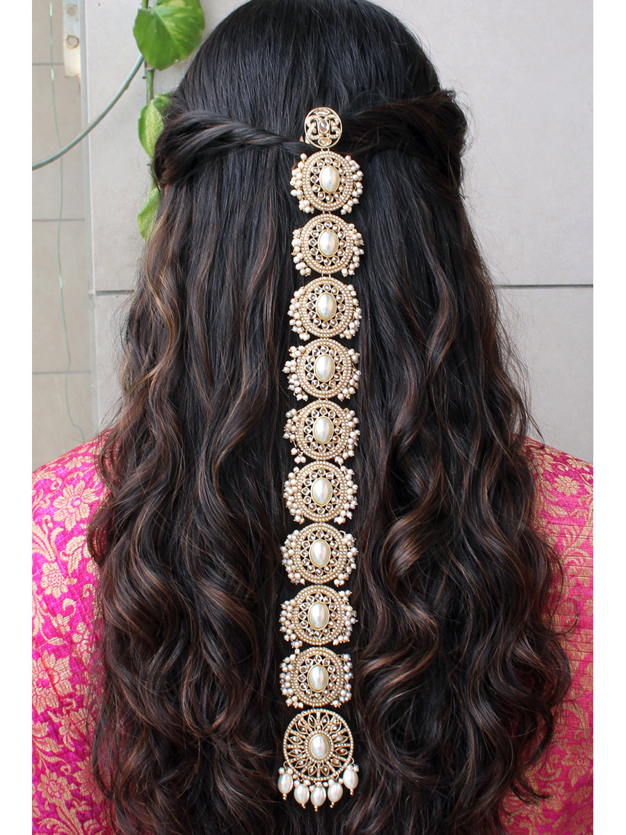 Presenting Our Antique Gold-Tone Braid Decoration Choti is a beautifully crafted hair accessory designed to elevate your traditional hairstyles with effortless grace. Adorned with intricately arranged simulated Polkis and accented with delicate faux pearls, it features elegant detailing from top to end. Crafted from high-grade alloy metal, this piece offers both durability and timeless charm. Its rich antique finish and exquisite craftsmanship make it the perfect accessory for weddings, festive functions, and cultural celebrations. Ideal for brides, bridesmaids, or anyone looking to add a touch of heritage elegance to their braid, this choti is a captivating blend of tradition and sophistication.