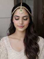 - Traditional Indian gold plated mathapatti studded with simulated Polki diamonds, Czs and green stone.