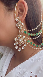 Gold Plated Earrings Studded with Simulated polki diamonds, Faux Pearls, and Emerald Green Stones.