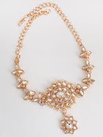 This stunning Rose Gold Finish Bridal Set is adorned with faux pearls, simulated kundan, pastel pink stones, and beads, creating an elegant and sophisticated look for your special day. The choker and long necklace are designed with an adjustable cord, ensuring a perfect fit for various neck sizes. The earrings feature post back findings for pierced ears, offering both style and comfort. The set includes slave bracelets, a nose ring, and a mathapatti, all adjustable to fit your unique preferences. Crafted from high-grade alloy metal, this jewelry set combines timeless beauty with modern elegance, making it a perfect choice for your wedding ensemble.