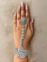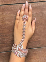 1 Pc silver / rose gold finish hand harness/bracelet studded with simulated diamond CZs, polkis, multi color and cut baguette stones.