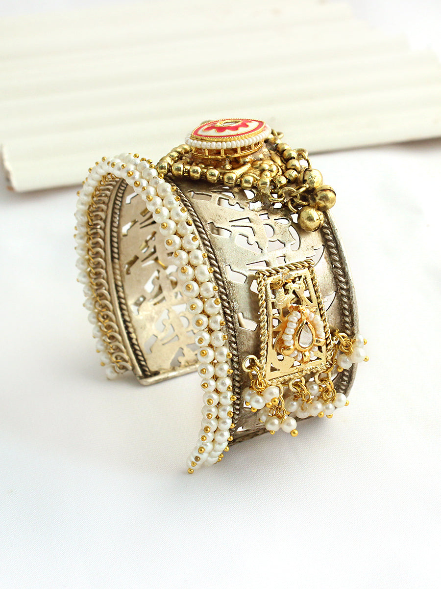 Elevate your traditional look with our Two Tone Amoha Cuff Bangle Bracelet, a perfect blend of artistry and elegance. Crafted from high-grade alloy metal, this intricately designed cuff features delicate cutwork detailing and is adorned with simulated Kundans, rich enamel work, faux pearls, and golden ghunghroos. The two-tone finish adds a regal charm, making it an ideal statement piece for weddings, festive occasions, and cultural celebrations.