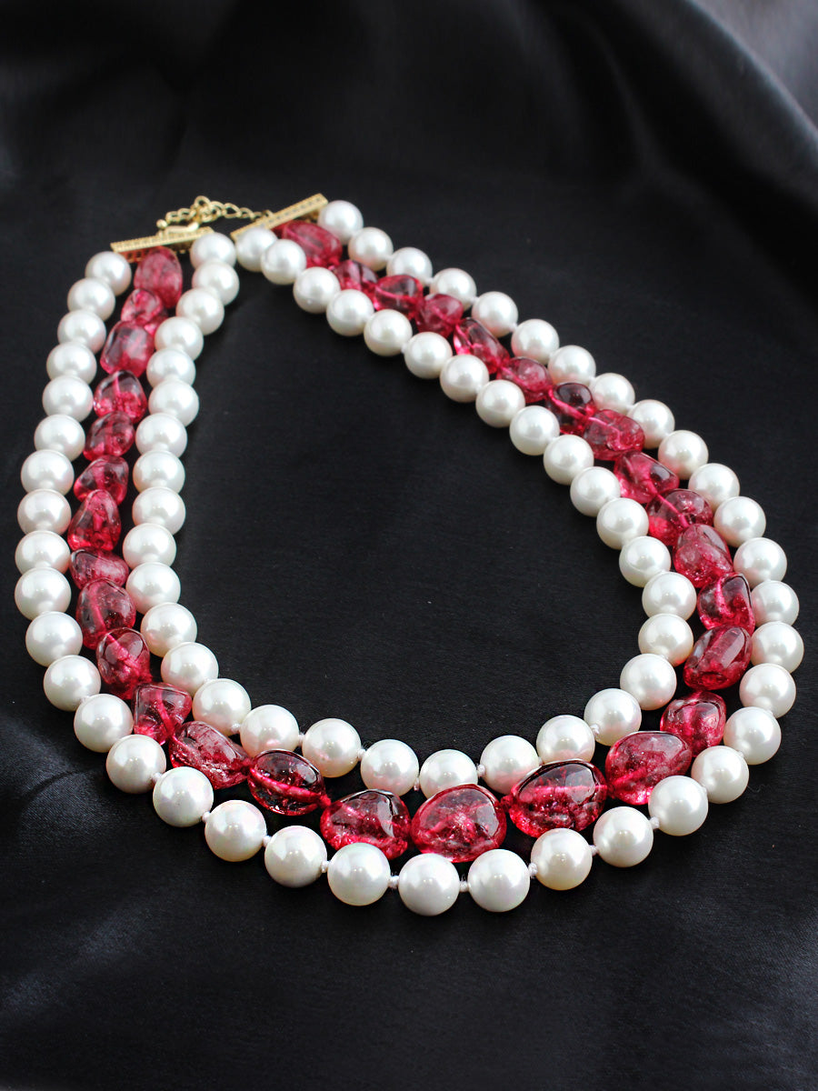 The Gold Tone 3-Layered Necklace is studded with pearls and ruby pink shattered beads. The necklace measures approximately 20 1/2" in length and features a clasp lock. Please note that the beads in the necklace have natural lines and shades, which adds to their appearance and is not considered a defect. The base of the necklace is made of high-grade alloy metal.