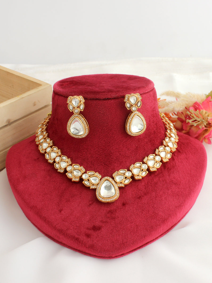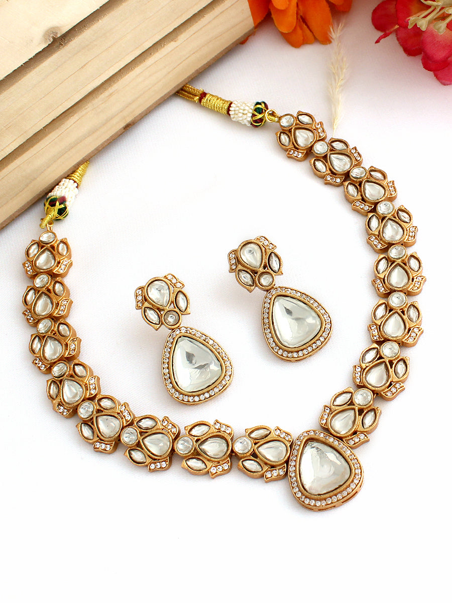 A matte gold finish bib necklace embellished with simulated polki diamonds and CZs. The necklace has an approximate length of 10 inches, featuring an adjustable cord for a customized fit on all neck sizes. The earrings measure around 80mm (L) x 25mm (W) or 3 1/4" (L) x 1" (W) with post back findings suitable for pierced ears. Crafted from high-grade alloy metal, this set exudes elegance and style in its design.