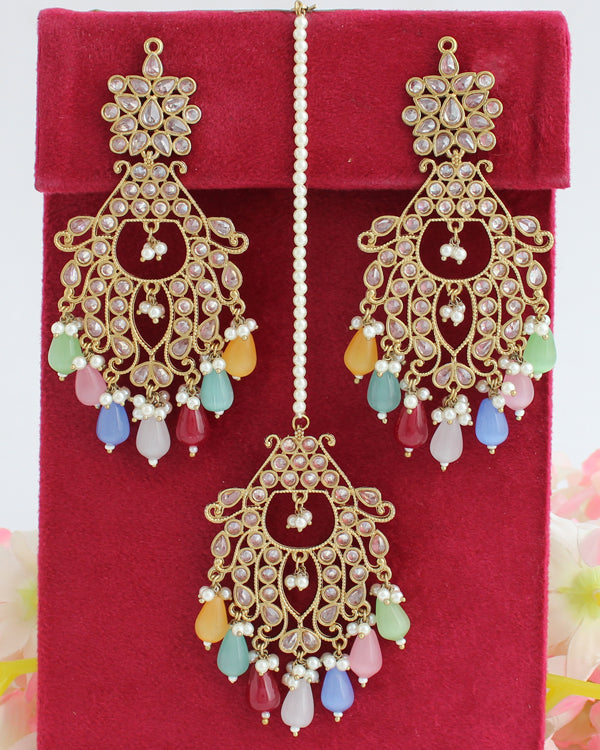 Gold tone long dangle earrings studded with simulated polkis, faux pearls and multicolor beads.