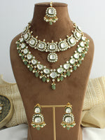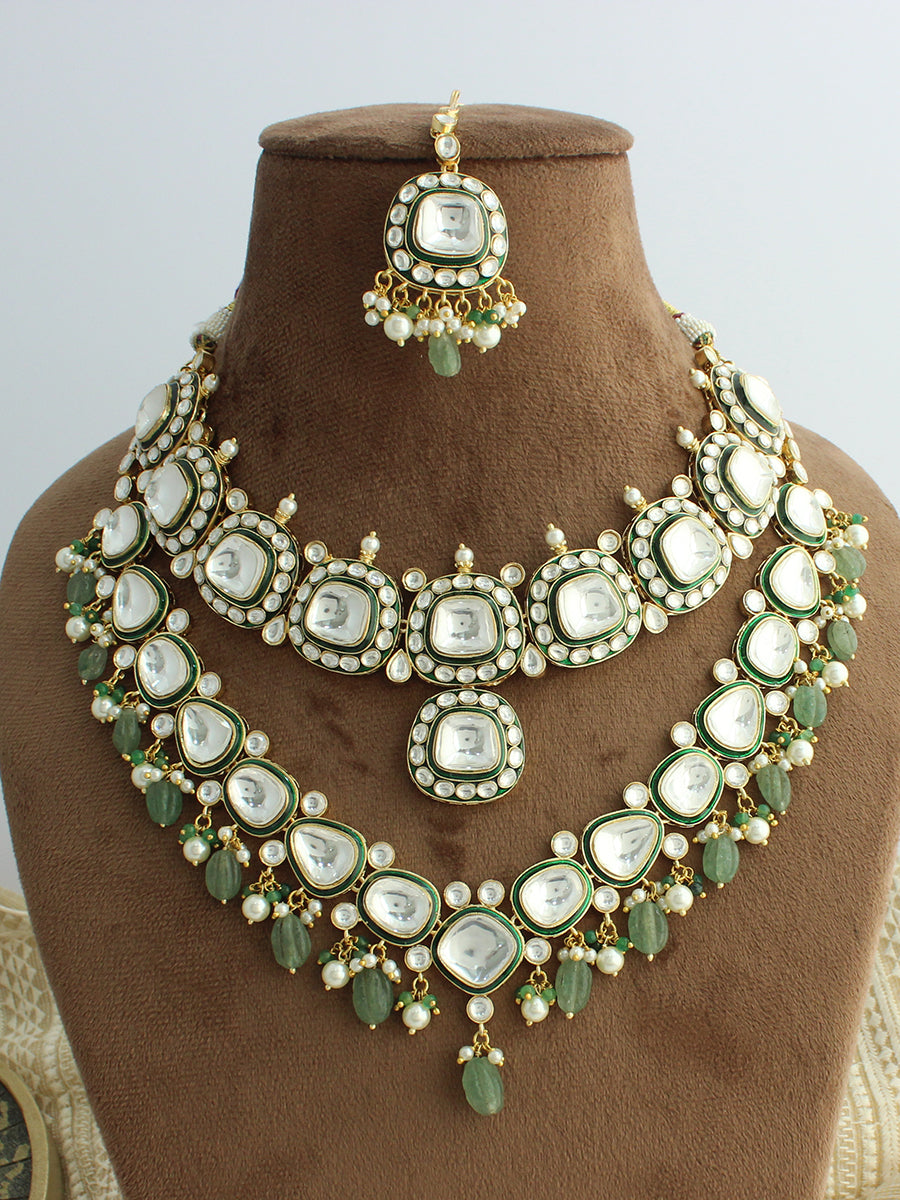 Introducing the 'Firdous,' a layered necklace fit for a queen. This exquisite piece features a captivating blend of green enamel work, dazzling polki diamonds, and intricately carved mint beads, all adorned with delicate pearls. The 'Firdous' is complemented by stunning dangling earrings and a tikka, creating a bridal ensemble that is both elegant and opulent. The contrasting colors of green and polki diamonds create a striking visual impact, making it the perfect choice for brides seeking a statement piece.