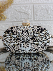 This clutch bag box adorned with CZs, Pearls and zardozi hand embroidery, it has a metal frame with a metallic clasp lock. It features an optional golden chain shoulder strap. This bag can fit a smartphone, makeup, keys, currency and cards.