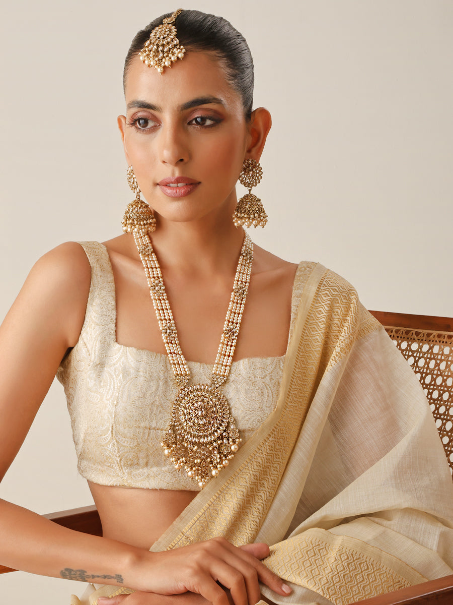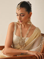 The Gold Tone Long Necklace Set studded with simulated polkis, multi-color beads, and faux pearls is a captivating ensemble. Here are the details: