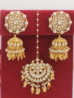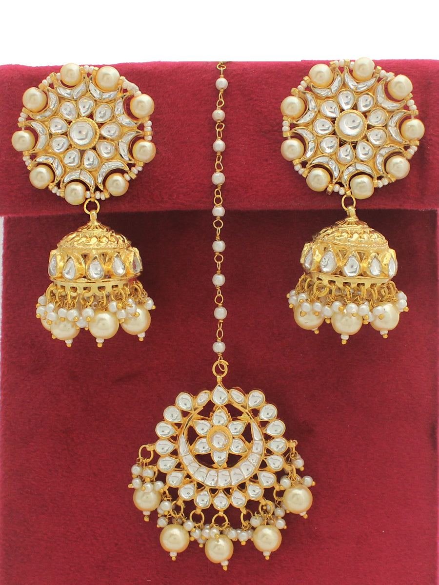 - Enhance your bridal look with the tikka featuring Kundan, Pearl Pippal Patti, and Beads, adding a touch of traditional charm.