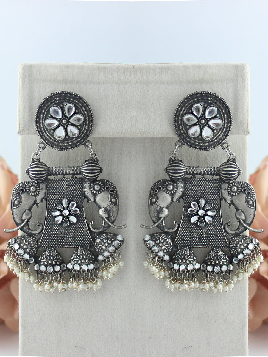 Oxidized Silver Elephant Face Earrings studded With Simulated Kundan and Faux Pearls. Measures approx : 110 x 60mm OR 4 1/2" x 2 1/2" with post back findings for pierced ears. Base : High grade alloy metal