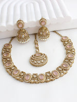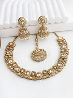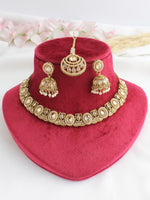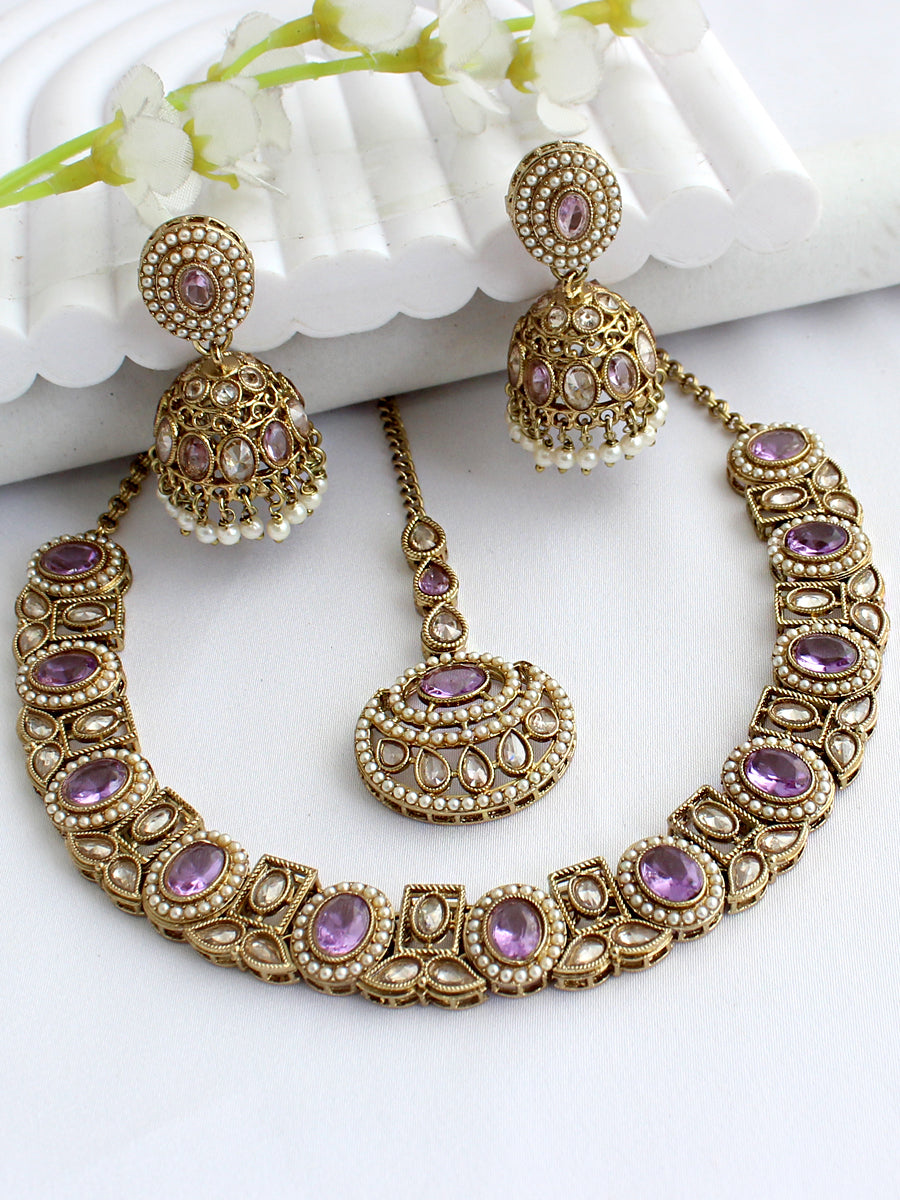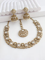Embrace the timeless beauty of tradition with this exquisite Polki necklace set, designed to add a touch of royal elegance to your ethnic ensemble. Adorned with sparkling Polki stones and intricate detailing, this handcrafted piece reflects rich cultural artistry and sophistication. The necklace features a luxurious gold-tone finish, highlighted by delicate motifs, while the matching jhumkis complete the set with a graceful flair. Whether it’s a wedding, festive occasion, or a grand celebration, this set makes a perfect statement of heritage and glamour.