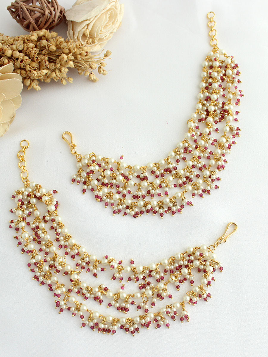 Introducing our 3-Layered Gold Tone Ear Chain / Kaan Chain. Add a graceful touch to your traditional look with this elegant 3-layered ear chain, beautifully crafted in a radiant gold tone. Studded with delicate faux pearls and beads, this kaan chain drapes gracefully along the ear, blending timeless charm with refined sophistication. Perfect for weddings, festive occasions, or cultural celebrations, it's the ideal accessory to elevate your ensemble with subtle elegance and style.