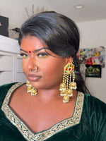 Gold Plated Earrings studded with Simulated Navratan Stones (Multicolored), Faux Pearls and dangling Jhumkis.