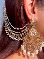 3-layered wedding wear ear (kaan) chain studded with simulated polkis, faux pearls, hot pink, pastel pink, mint green, black, aqua, purple, lavender, yellow, olive-green stones, and beads.
