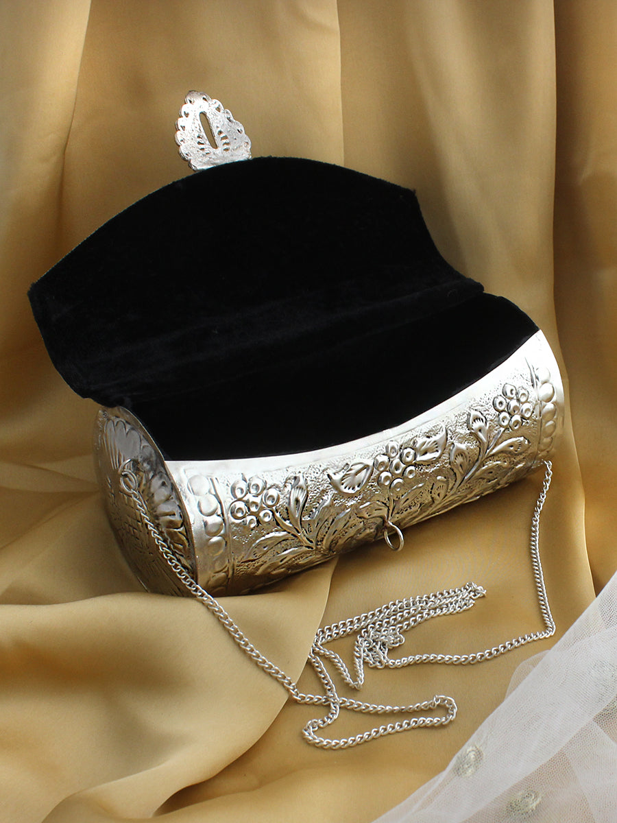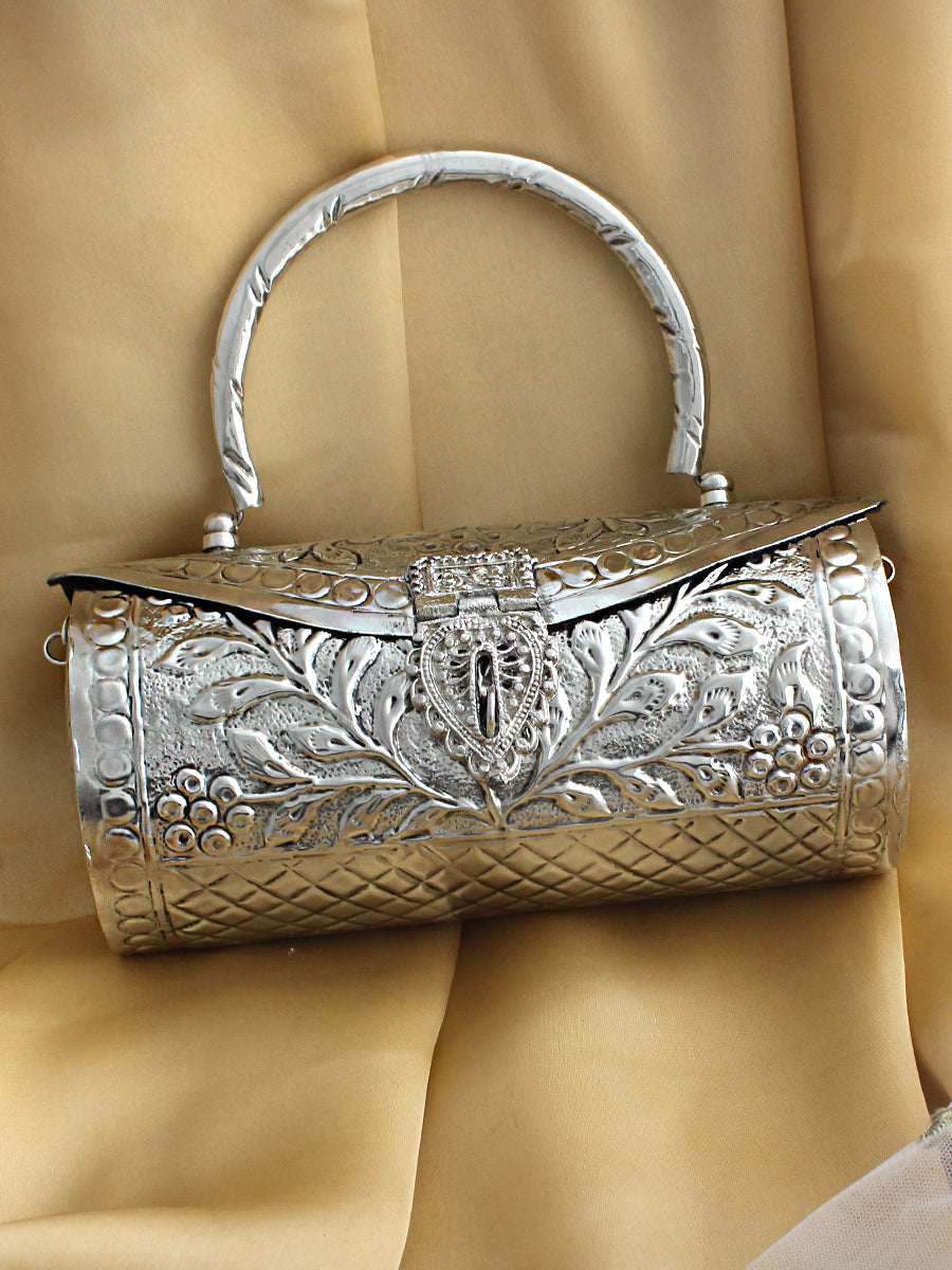 Elevate your festive look with this elegant antique silver-finish metal clutch, featuring intricate embossed traditional motifs and a regal cylindrical silhouette. Crafted from premium metal, it comes with an engraved top handle, secure decorative clasp, and a shoulder chain. Spacious enough for essentials, it’s perfect for weddings, parties, and festive occasions, pairing beautifully with ethnic and Indo-western outfits.