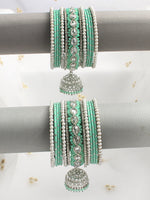Introducing a stunning 30 piece (2 set) Mint Green Bangle Set, designed to add a touch of sophistication and glamour to any celebration. This exquisite set is adorned with faux pearls and Mirrors, providing a perfect blend of elegance and sparkle. Crafted from high-grade alloy metal, The intricate detailing, combined with sparkling mirrors, makes this set the ideal accessory for weddings, receptions, and other special events. Designed to fit both hands, it adds a luxurious flair to your look, elevating your style for any occasion.