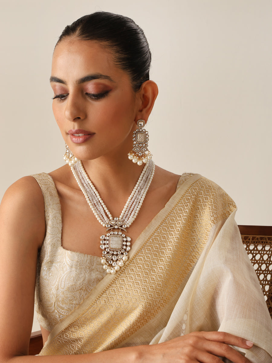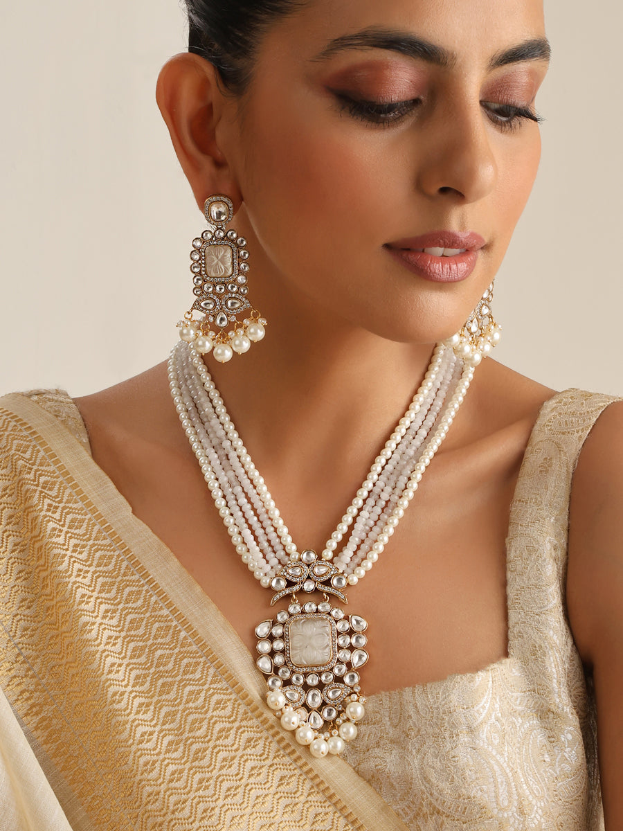 Gold plated long necklace set studded with simulated polki diamonds, faux pearls, carved stones and shaded beads.