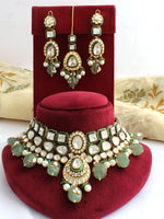 Introducing the Rivanya Necklace – a regal masterpiece that exudes timeless sophistication and grace. This exquisite design brings together the delicate artistry of green enamel, dazzling polki diamonds, and the soft elegance of carved mint stones and pearls add a touch of ethereal charm, completing the look of royalty. Each element has been meticulously crafted to form a stunning, harmonious statement piece. The Rivanya Necklace is paired with a set of breathtaking teardrop earrings and a matching tikka, offering a complete bridal ensemble that radiates both luxury and refinement. A perfect choice for brides who wish to make a bold yet refined statement on their special day, this set will leave a lasting impression.