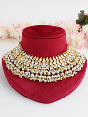 Gold plated bib necklace set studded with simulated kundans and pearls beads.