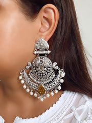 - Antique silver / gold plated earrings studded with simulated peach & yellow hand carved stones faux pearls and beads.