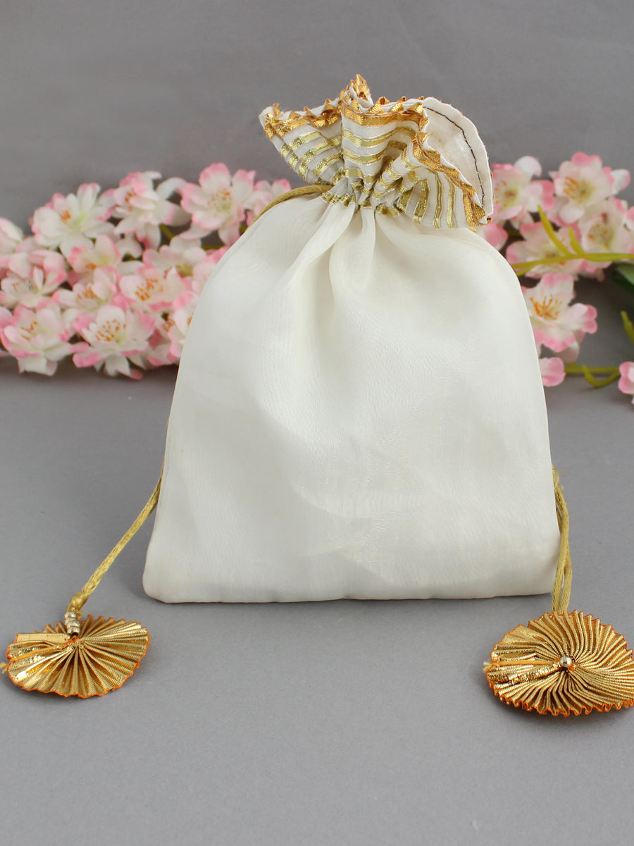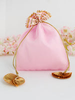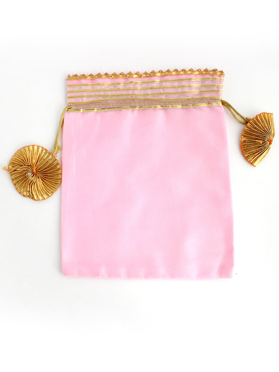 Wedding favors tissue potli bags with gota border, the potli comes with a string to tighten it and gota tassels in the end.
